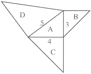 10. A partir de un triángulo rectángulo de lados, 3, 4 y 5, construimos triángulos rectángulos e isósceles como indica la figura. Si A, B, C, D representan el área de cada uno de esos triángulos, ¿qué afirmación de las siguientes es verdadera?