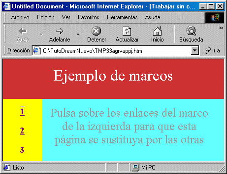 Una vez decidido qué conjunto de marcos vamos a utilizar hacemos un clic sobre el icono y el conjunto de marcos dividirá nuestra página. Si no estamos de acuerdo con la anchura de los marcos podemos modificarlo simplemente situándonos con el cursor en el borde y arrastrando.