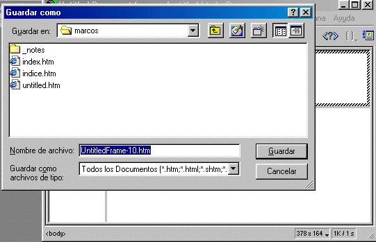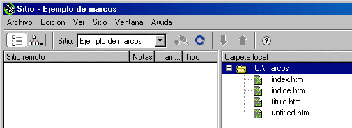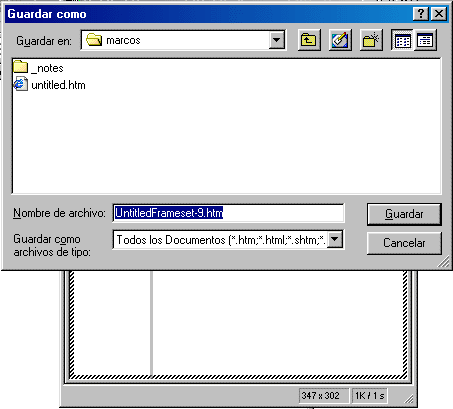 Observa que a la carpeta raíz del sitio la hemos llamado marcos, luego vamos a guardar en esta carpeta los frames creados. Puede ocurrir que Dreamweaver intente guardarlo en otro sitio, en ese caso tienes que buscar la carpeta marcos dentro del disco duro C. Observa, también, que aparece, aparte de la carpeta _notes, un documento denominado untitled.htm (más adelante sabremos qué documento es éste).