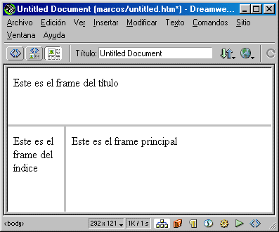 En este momento, Dreamweaver ya ha creado 4 diferentes documentos: El primero que es el que contiene la estructura de los tres marcos (frameset) y uno por cada marco (el superior, el izquierdo y el principal) los frames. Podemos, ahora, escribir algo en cada una de las tres partes para identificarlas posteriormente: Por ejemplo: