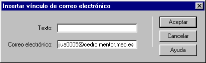 En el Texto: escribimos la palabra o palabras que queramos sean el enlace al correo (puede ser el nombre y apellido de la persona a cuyo correo enlazamos) y en el segundo cuadro de texto, eliminamos la dirección de correo que haya, y escribimos la que nos interese.