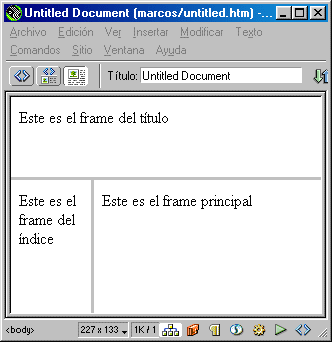 Si sólo hubiese esa división en dos filas, ahora vendría la etiqueta de esa segunda fila, pero como la segunda fila se ha dividido en dos columnas, eso es otro frameset, que es la etiqueta que viene en la tercera línea:
