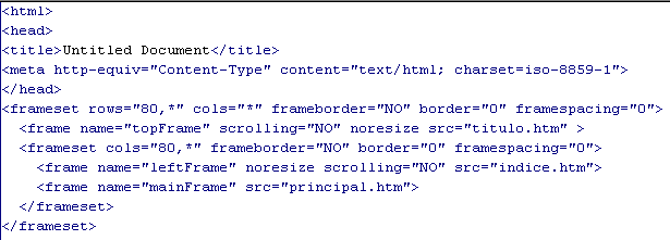 Nos fijamos en la etiqueta <frameset rows"80,*" . Esto nos está diciendo que la primera estructura de marcos es una división del espacio en una fila de 80 píxeles y "lo que quede" (eso indica el asterisco). El resto de esa línea lo dejamos de momento.
