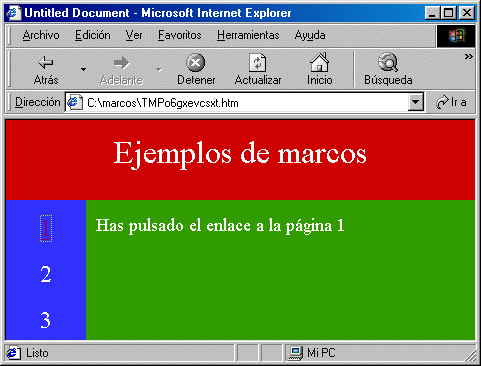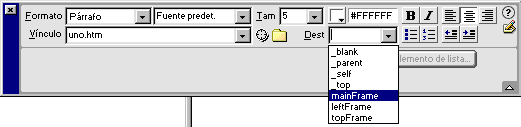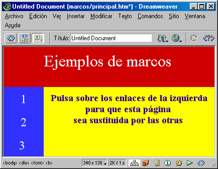 El documento que va a tener los enlaces se recomienda que sea modificado dentro de la estructura de marcos para poder elegir el destino de los enlaces. Así colocamos el texto, los fondos, que nos parezca y, cuando vayamos a hacer los enlaces: